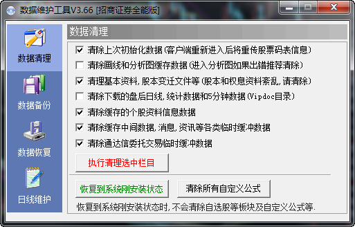 取补数据、整理清理数据等操作。当天数据的盘后转档可以方便地进行收盘。选股和测试等时数据不够时,系统会自动提示。