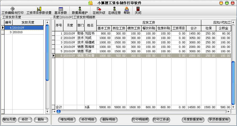 点界面底部功能按钮:打印明细(工资)表,可连续打印工资条。