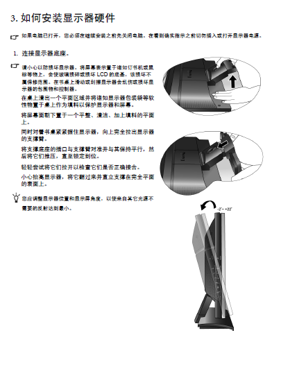 BenQ明基FP222W采用1680 x 1050 视频分辨率,明基FP222W显示器怎么安装调试呢?这里给大家带来的是明基FP222W显示器使用说明书,需要的朋友可以免费进行下载。