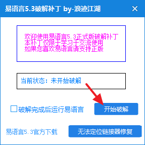 易语言5.3破解补丁是一款绿色小巧的易语言5.3正式版破解补丁工具。该工具内提供了5.3正式版下载链接,操作简单、一键破解,终身有效!欢迎有需要的用户下载使用!