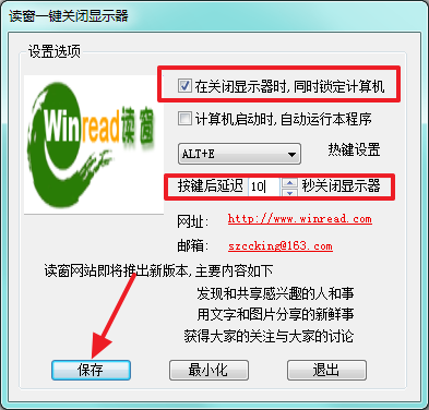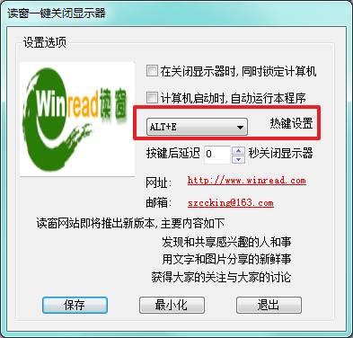 读窗一键关闭显示器是一款绿色小巧的用于帮助使用笔记本电脑的用户自动关闭显示器。操作简单,可自定义快捷键,同时支持按键后延时关闭。欢迎有需要的用户下载使用!