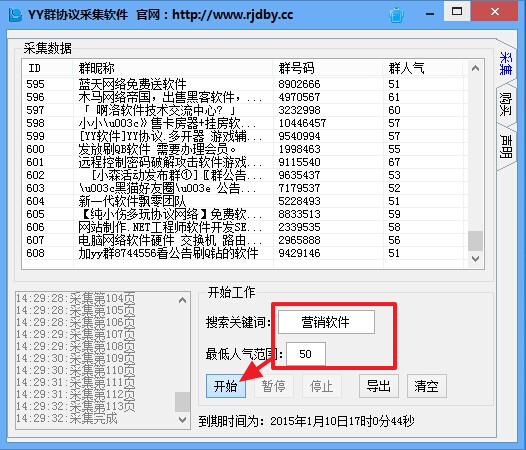 设定采集关键词以及最低人气,点击【开始】即可采集