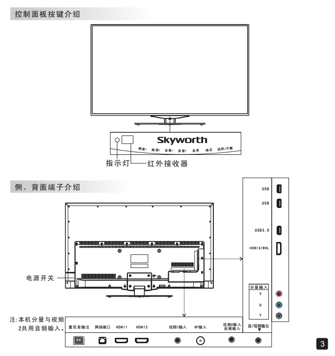 控制面板按键及侧、背面端子介绍………………………………………………3