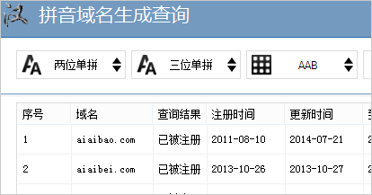 拼音域名生成查询软件是一款专业的域名批量生成查询软件,支持批量查询生成的拼音域名,支持COM/NET/ORG/INFO等域名,VIP版支持CN/RU/XXX等全后缀,功能非常强大。