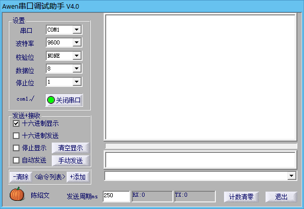 Awen串口调试助手是一款绿色免费的串口调试工具,可以设置各种通讯速率、奇偶校验、通讯口而无需重新启动程序。软件能以ASCII码或十六进制接收或发送任何数据或字符,可以任意设定自动发送周期,并能将接收数据保存成文本文件,能发送任意大小的文本文件。