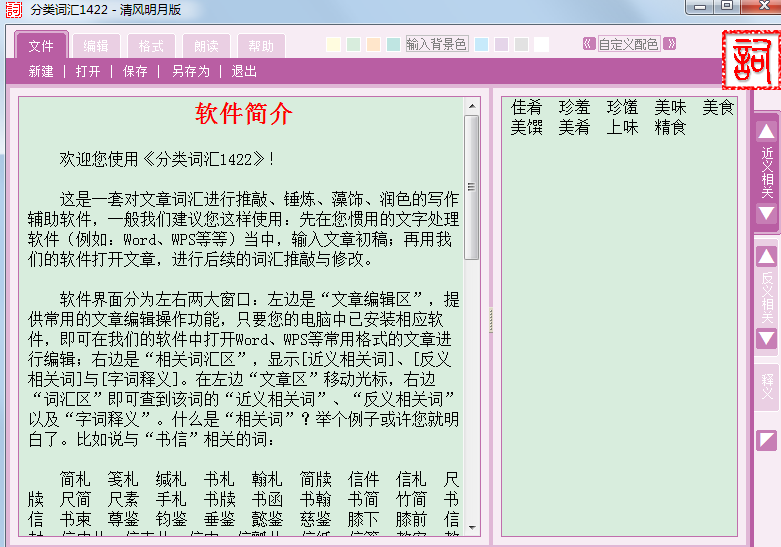 软件界面分为左右两大窗口:左边是“文章编辑区”,提供常用的文章编辑操作功能,只要您的电脑中已安装相应软件,即可在我们的软件中打开Word、WPS等常用格式的文章进行编辑;右边是“相关词汇区”,显示[近义相关词]、[反义相关词]与[字词释义]。在左边“文章区”移动光标,右边“词汇区”即可查到该词的“近义相关词”、“反义相关词”以及“字词释义”。什么是“相关词”?举个例子或许您就明白了。比如说与“书信”相关的词: