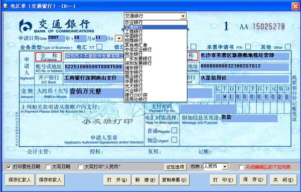 图五、电汇单填开:(若银行票据升级,小灰狼提供免费票据格式补丁升级)