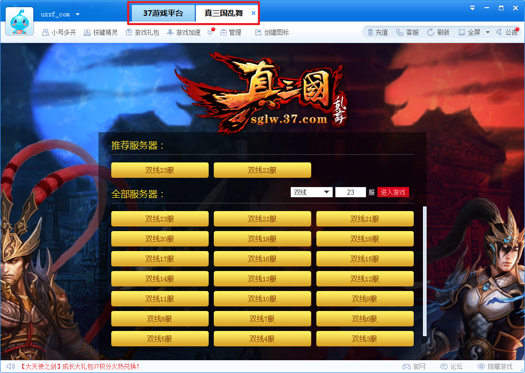 37真三国乱舞微端是由37wan为《真三国乱舞》制作的一款登陆器。使用该登陆器可方便登陆游戏,同时该微端还具有相关辅助功能,如小号多开、按键精灵等,让玩家更方便的体验游戏。欢迎下载使用!