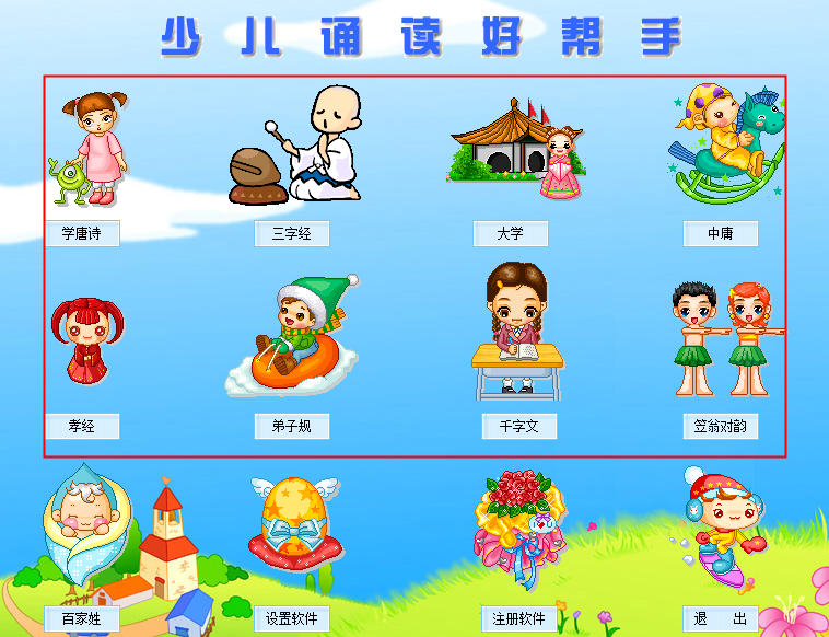 它集声音,图像,动画,文字与一体,让你的孩子在不知不觉中学习到做人的道理。本软件收集了完整的《三字经》《弟子规》《孝经》《大学》《中庸》《千字文》《笠翁对韵》《百家姓》等著作,并配有图片和声音,寓教与乐。