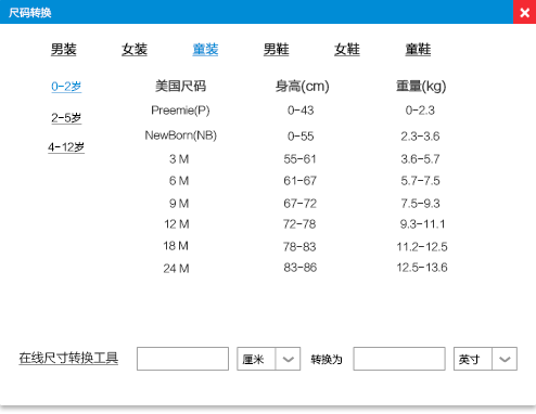 零米海淘神器的"帮我买"功能中,"明细"中有尺码转换,可以供您参考,方便您在选购商品时对尺码的选 择。进入尺码转换页面时,选择性别和您需要购买的商品类型,就能看到对应的尺码。