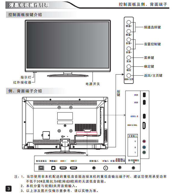 控制面板按键及侧、背面端子介绍………………………………………………3