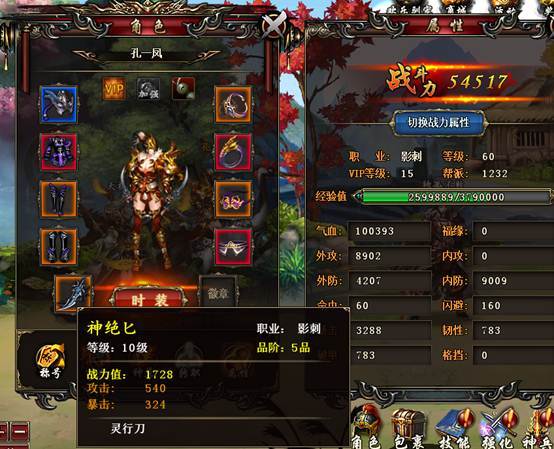 玩家最多可穿戴10种不同的装备。鼠标移上装备就能查看装备资料,包括名称、职业、等级、品阶、战力值、属性和售价。