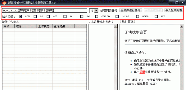 超级站长未注册域名批量查询工具是一款绿色免费的域名批量查询软件,可根据自定义规则生成并查询所有未注册的域名。软件使用TCP协议直接介入WHOIS服务器端口,采用多线程技术,并根据生成规则生成批量域名,查询准确、快速、方便。