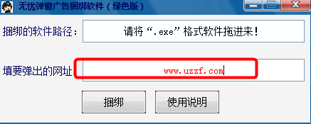 1、将您想捆绑广告的软件(例如:XX.exe)拖入本软件窗口中,本软件自动读取软件路径并显示在“捆绑的软件路径”中;