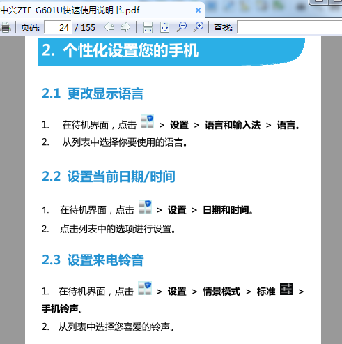 中兴ZTE G601U是一款4英寸3G智能手机,Android OS 4.2操作系统,双核处理器,前后双摄像头,支持AMR/AAC/MP3/MIDI/WAV/OGG等格式。以下文档是中兴ZTE G601U使用说明书,有需要的朋友可立即下载此文档。