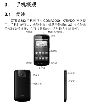 中兴ZTE G882是一款3.8英寸3G智能手机,Android 2.3操作系统,不支持Java扩展,内置GPS,支持A-GPS。以下文档是中兴ZTE G882使用说明书,有需要的朋友可立即下载此文档。