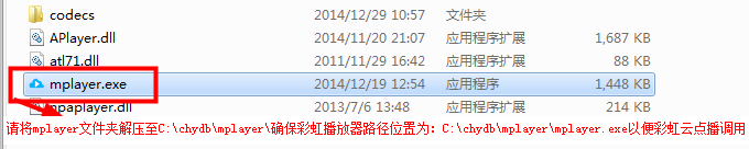 请将mplayer文件夹解压至C:\chydb\mplayer\确保彩虹播放器路径位置为:C:\chydb\mplayer\mplayer.exe以便彩虹云点播调用播放!