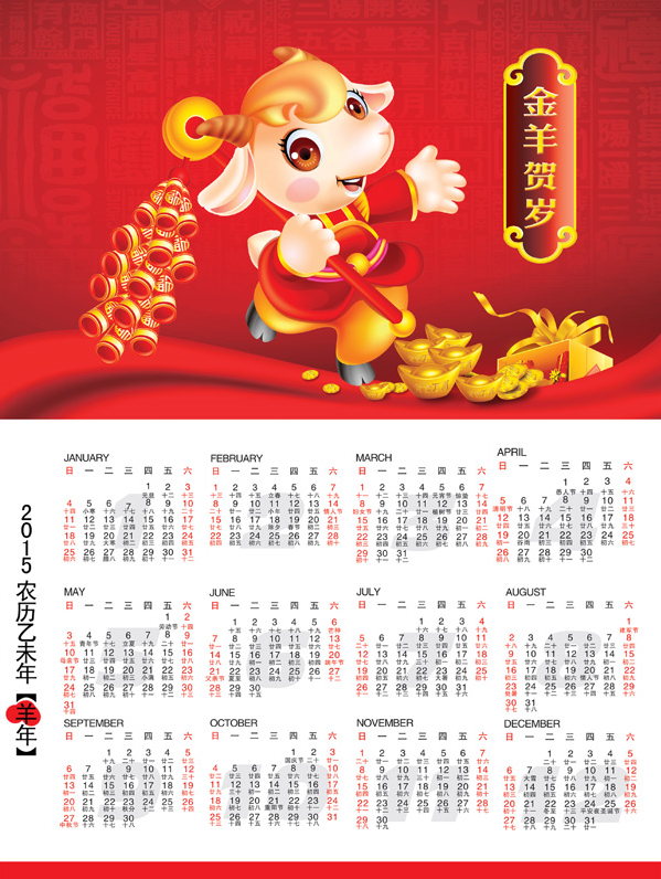 这里给大家分享的是2015金羊贺岁挂历模板,2015挂历模板免费下载,喜庆版psd格式,psd素材免费下载。
