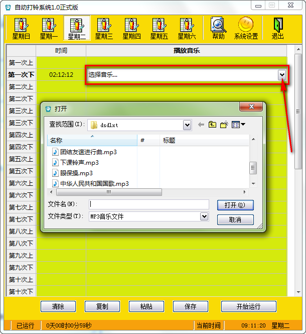 3、设置播放音乐路径,内置了几种常用的铃声。也可以选择您需要播放的任意MP3格式的文件。