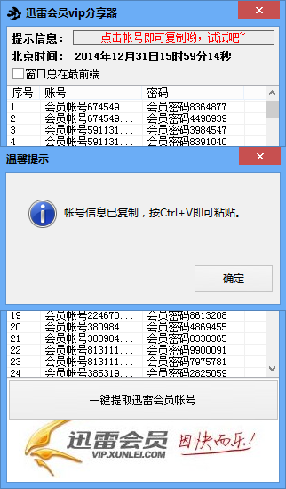 迅雷会员VIP分享器是一款绿色免费的迅雷会员账号获取器。该软件绝对是目前迅雷会员账号最多、最全、日更新量最大的迅雷会员账号获取器,全都稳定可用。欢迎有需要的用户下载使用!