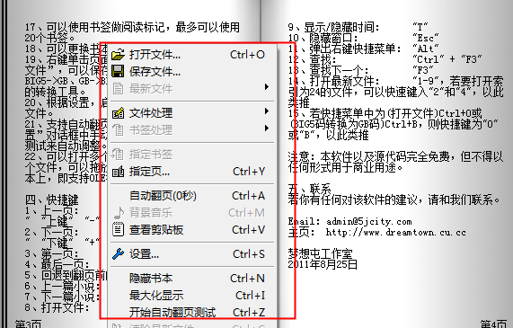 21、支持自动翻页,自动翻页时间可以在“设置”对话框中手动调整,也可以使用自动翻页测试来自动调整。