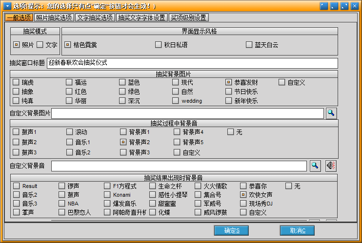 瑞虎抽奖软件可自定义背景,照片,标题,奖项级别,滚动速度 、背景音乐等,配合投影仪,可极大烘托庆典气氛,适用于联欢会、婚礼现场等庆典场合,为庆典抽奖必备的工具软件。 本软件最多可同时抽取6张中奖照片并可以自动压缩照片文件。