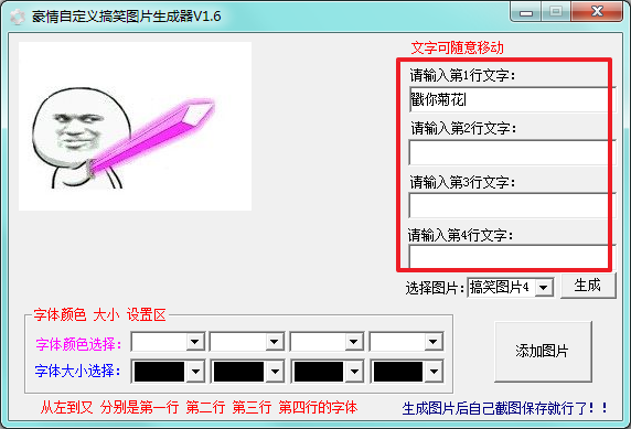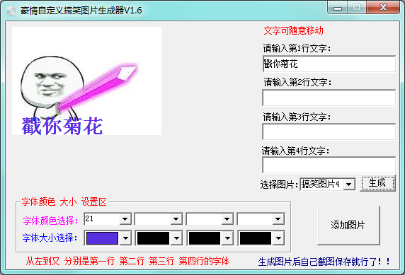 豪情自定义搞笑图片生成器是一款绿色小巧的搞笑图片制作工具。该图片支持自定义图片、自定义文字(4行文字)、自定义文字颜色大小等,生成只属于自己的搞笑图片。欢迎有需要的用户下载使用!