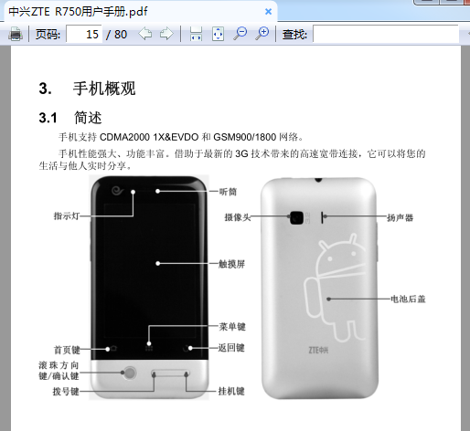 中兴ZTE R750是一款3.2英寸3G智能手机,Android OS 2.1操作系统,后置320万像素摄像头,机身颜色为白色,支持MIDI/MP3/AAC等格式。以下文档是中兴ZTE R750使用说明书,有需压迫的朋友可立即下载此文档。