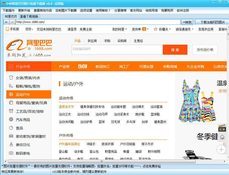 例如想下载: http://cssdmy.cn.alibaba.com 的“外套”分类下的阿里巴巴产品图片, 只要输入该“外套”分类的网址 http://cssdmy.cn.alibaba.com/athena/offerlist/cssdmy-sale-true-2401273.html , 勾选下载方式“下载分类产品图片”,点击“查看相册图片”,等预览到阿里巴巴分类产品图片时就可以下载了。