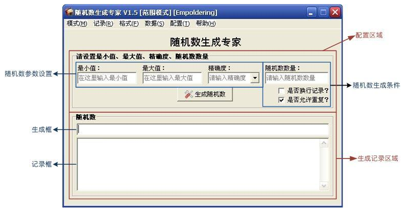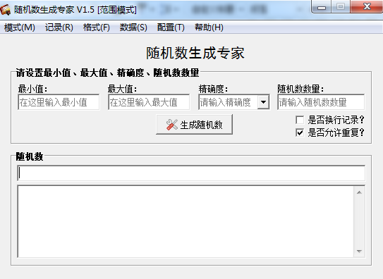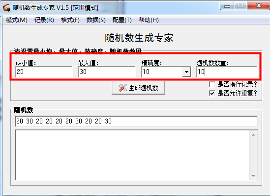 范围模式下可生成一定范围内的具有一定精确度的随机数。在本软件中,精确度是一个能被生成的随机数整除的数,它可以任意正整数或正小数。此模式下,通过设置随机数的最小值、最大值、精确度和生成的数量,即可获得您需要随机数。