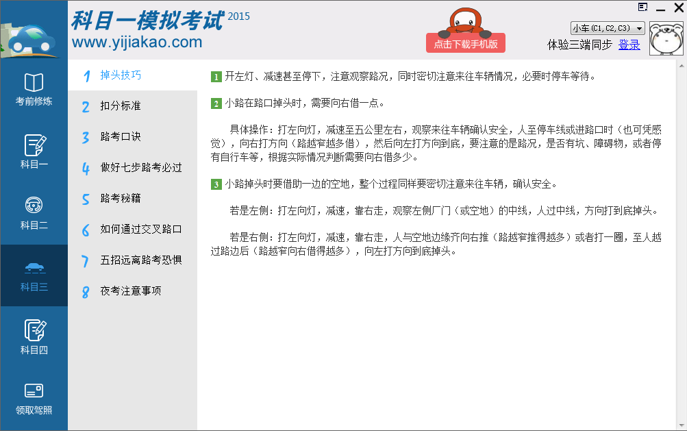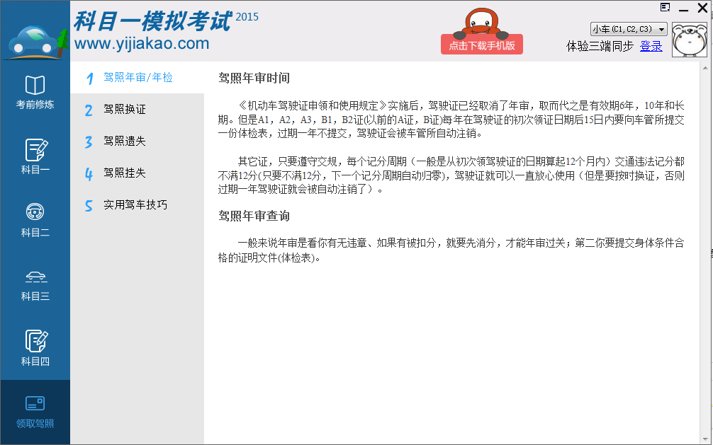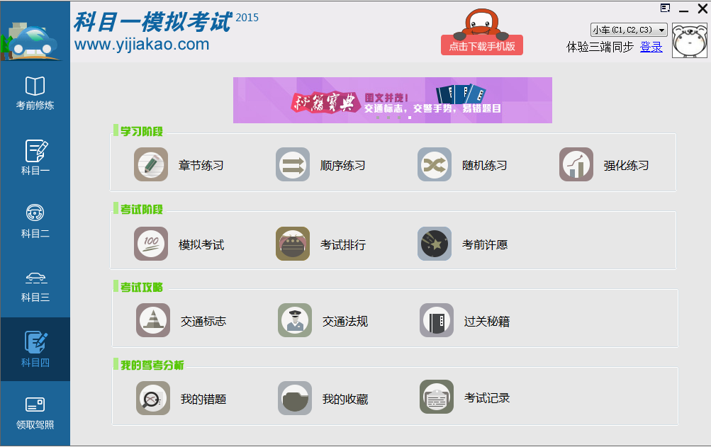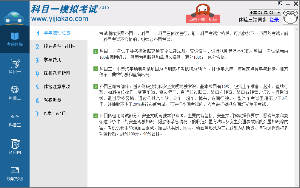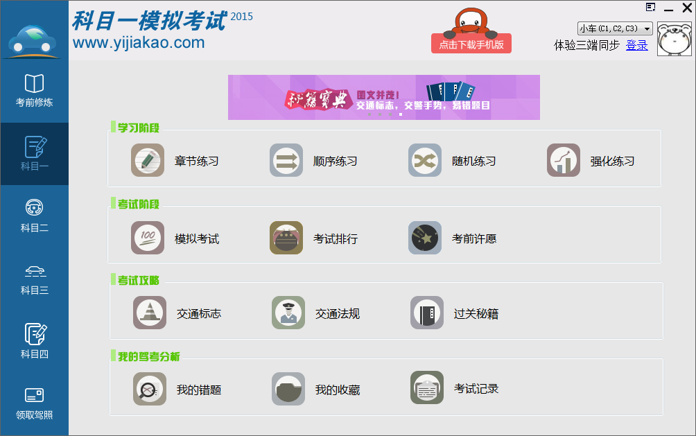 易驾考科目一模拟考试2015是一款2015最新版的科目一学习、模拟考试答题软件。该软件拥有2015最新版驾考题库,拥有超强的记忆训练(错漏杂题训练)、超多应试技巧,助你成功。欢迎有需要的用户下载使用!