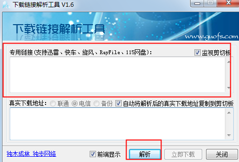 默认会智能监视剪切板,比如你在网页复制了专用链后,软件会自动复制过去,你只需要点解析即可。