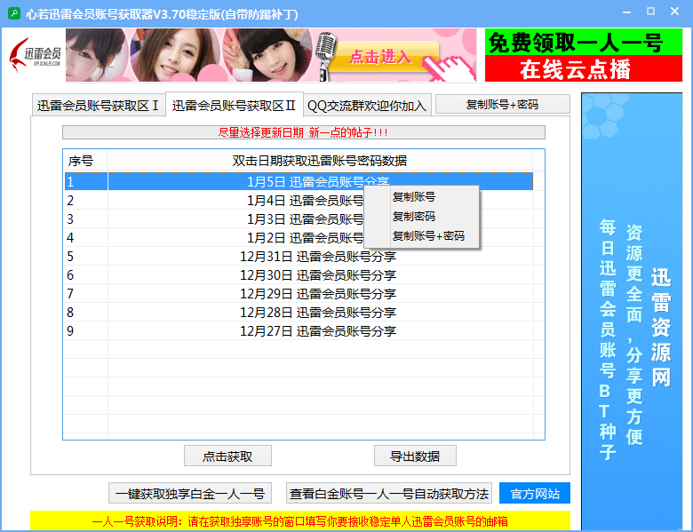 如获取的迅雷会员账号密码错误,请多试几个,如果还不行可点软件上面的一键获取独享白金一人一号,按要求操作既可将一人一号发到你邮箱。