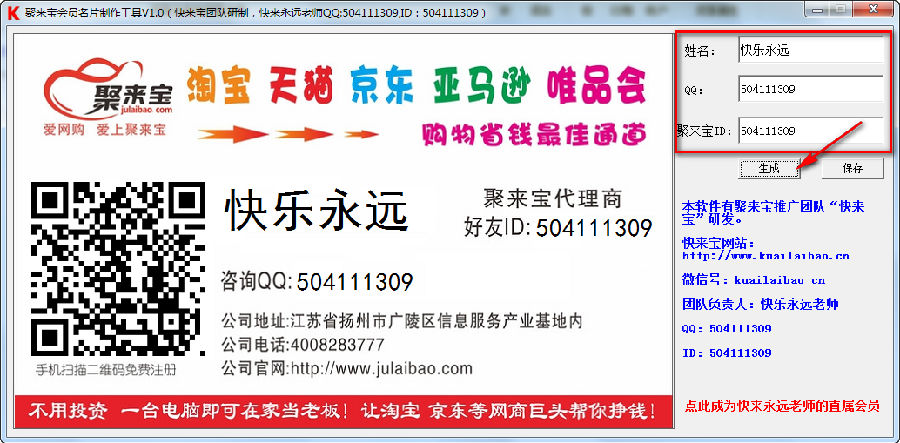 聚来宝名片制作工具是一款由聚来宝推广团队“快来宝”研发的名片制作软件,本软件免费提供给快来宝团队会员使用。
