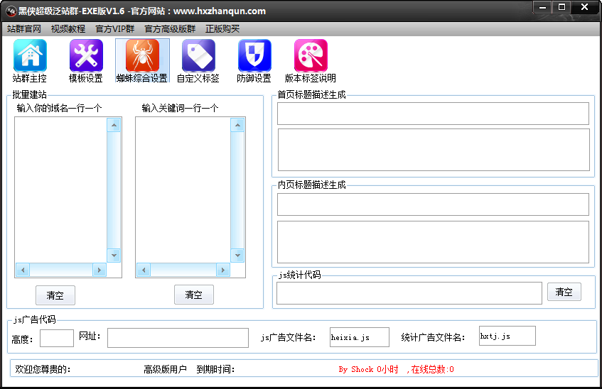 黑侠EXE版超级泛站群(站群软件)是一款功能强大且简单易于使用的技术领先站群软件,不需要依赖CMS无需iis即可建站的首创批量建站软件。具有一键更新广告、一键链轮、内置文章原创内核。无论在排名的靠前还是搜索引擎的收录方面都具有领先的优势,无限繁殖网页。排名也不打折扣。让你领略站群最前沿的技术。
