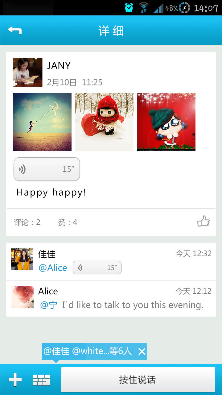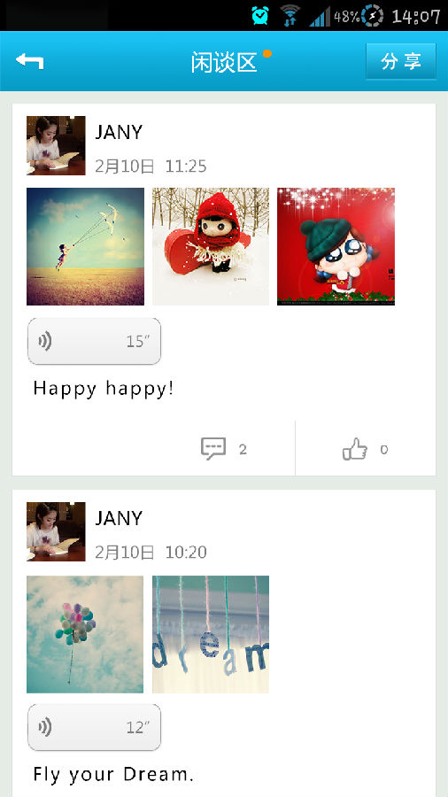 当然,也可以来交流广场,看看大家都在说什么,有这么多王尼玛、赵美丽在发表自己的文字、语音心情~O(∩_∩)O。你也快来参与吧!