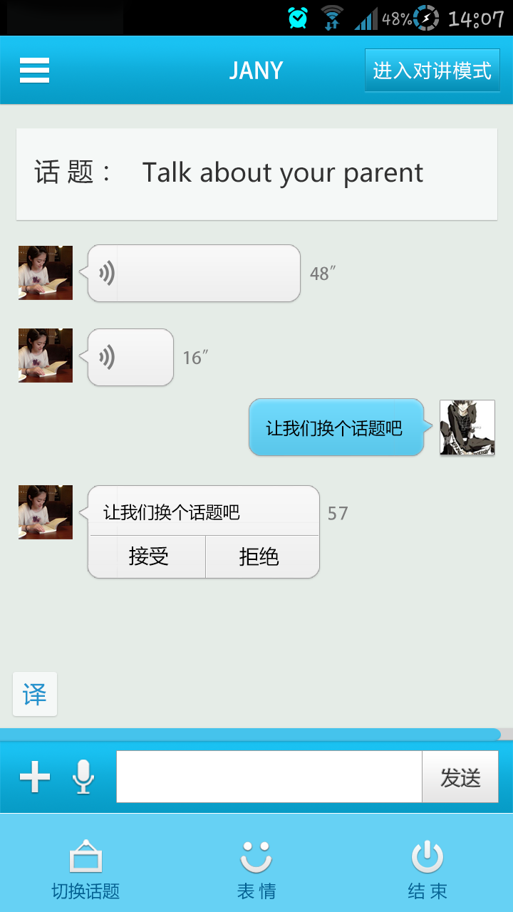 两种聊天方式,一种类似微信里的语音消息,一种模仿对讲机,小伙伴们按自己的口语习惯选择一种吧,小透露下:对讲模式是即说即听的,更刺激也更符合面对面的口语交流场景喔。