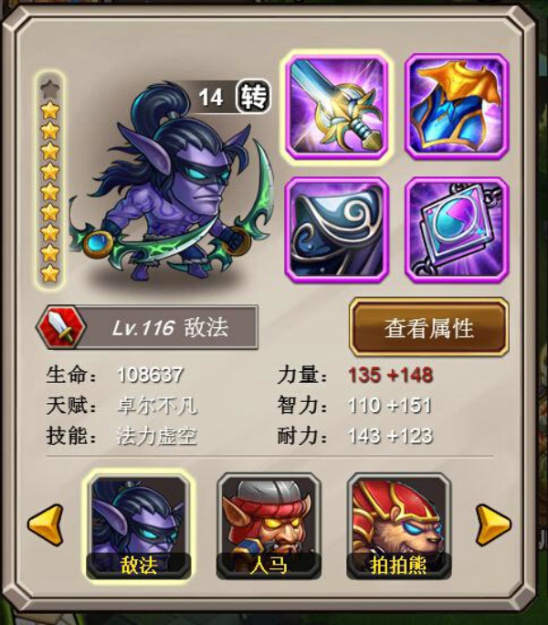 每个英雄可以装备4个部位的装备,分别为武器、衣服、披风、饰品;装备的品级也从白、绿、蓝、金、紫、红依次递增,品级越高属性值越好;