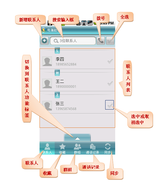 用户正确下载并在手机上安装号簿助手客户端后,即可使用客户端进行手机本地联系人管理,以及手机通讯录同步、上传和下载服务。