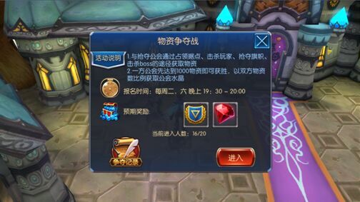 《无双剑姬》游戏中,物资争夺战是一个跨服大型公会pvp活动。每周二周六晚上19:30~20:00期间会长可以在公会中npc前线侦查员处报名匹配,待匹配成功后,自动提示所有在线成员物资争夺战开启的消息