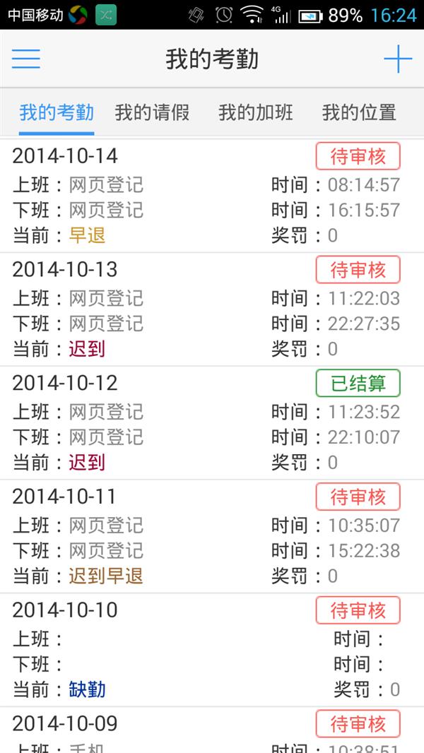 2. 打卡签到:通过导航菜单的“签到”快捷键,或者【考勤】-【我的考勤】中点击右上角“+”键进行签到,如下图: