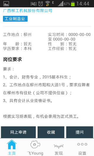 步骤三:页面的下方有三个选项,点击“网上申请”可直接申请该职位;点击“收藏,将心仪的职位放入收藏夹;若对岗位有任何疑问,可点击“提问”进入提问界面。