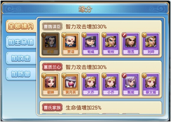 缘分武将共同上阵,可增加缘分效果,分为增加生命值、攻击、防御。