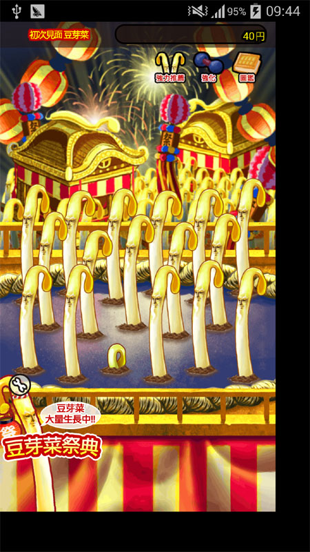 每个豆芽开始不太值钱,收货一根才1日元(有脸的豆芽谁要啊!),不过积小成多,多点浇水让它们长快一点吧!收获一定数量的时候会出现 FEVER 模式,这时豆芽可以不需等待就会成熟,这是赚钱的好时机!使出你浑身力气的一阳指(= =)把豆芽们都抽出来吧!每种豆芽收获一定数量就能达到升级的要求,这时可以用钱去帮我们帅气逼人的人脸豆芽升级,每升级一次收获时获得的钱就会越多。