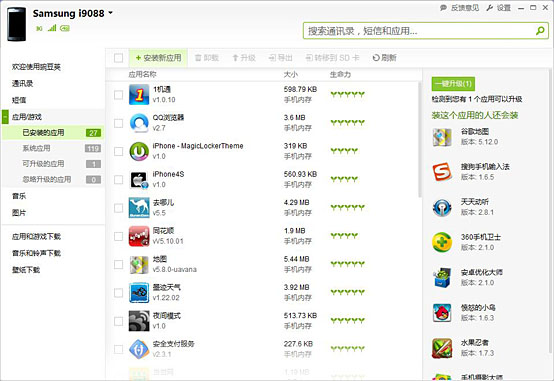(2)启动手机安装软件(例如豌豆荚手机精灵)并与手机连通,在软件主画面上点击"安装新应用",选择"添加文件",确定"掌上人保"软件在您电脑上的存放位置后,开始"安装"。
