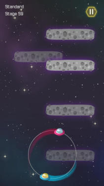 《宇宙二人转 Duet Escape》是一款虐心的休闲游戏,小编都不知道是我在玩这游戏还是这游戏在玩我。这游戏太考验协调力和胆量了,尤其是横框的时候,一定要调整好,等到一个飞船过去了然后赶紧转。忙中出错真是太常见了,小编真是被虐的体无完肤,如果哪位能通关小编真是膜拜的五体投地。