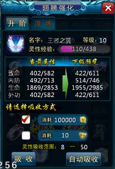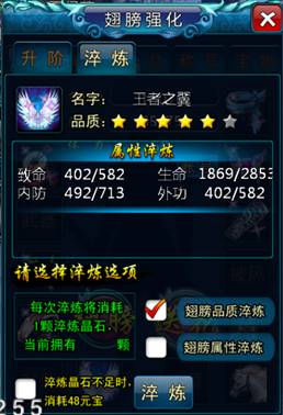 3、【升阶】即翅膀等级的提升,随着翅膀等级的提升,翅膀的额外加成属性也将得到全面的提升。翅膀的升级途径有两种:银两和元宝。