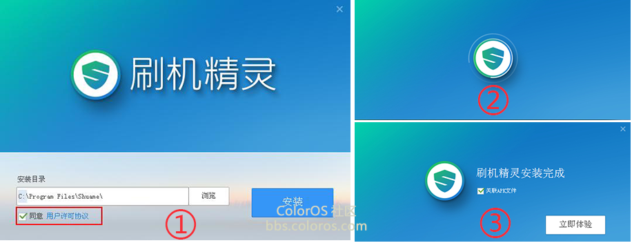 ①同意用户许可协议 → ②安装中 → ③关联APK文件,完成