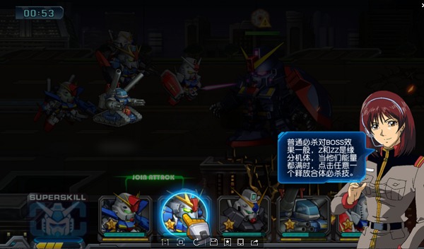 合体技:某些具有关联的机体(如自由高达与正义高达)可以释放威力巨大的联合必杀技,动画演出非常华丽。