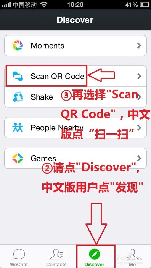 第二步,选择“Discover”(中文版用户请选择”发现”),进入后再选择”Scan QR Code”(中文版则是”扫一扫”)如图步骤2-3